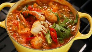 👉🏼 Se siete invece più attratti dalla cucina coreana, in questa stagione non potete perdervi la zuppa di granchio o kkotgetang (꽃게탕). Si tratta di una zuppa di frutti di mare piccante in cui viene